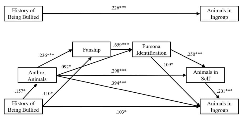 Given that our prior research at Furscience has shown us both that a) furries are a group loosely- defined by its shared interest in anthropomorphizing animals and b) that furries are significantly more likely than the average person to have a history of being bullied (Plante et al., 2023), we proposed a model (see figure below) integrating several existing strands of literature to suggest that those with a history of being bullied may feel a greater sense of connection to non-human animals, in part, because of their increased interest in, and identification with, anthropomorphized animals. We tested variants of this model across a series of furry samples from two different North American furry conventions and from a sample of furries in South Africa. We also tested the generalizability of the model in a non-furry sample of undergraduate students.